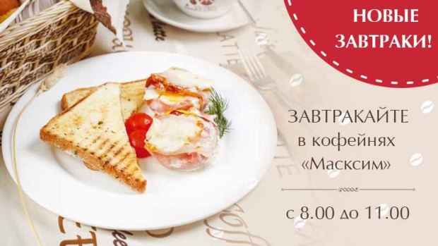 Сеть кофеен «МаксиМ» приглашает на завтраки – каждый день с 8.00 до 11.00 всего за 200 рублей можно получить один из восьми великолепных завтраков и напиток на выбор – натуральный чай или кофе. Вниманию гостей сети кофеен – завтраки французский, деревенский, сытный, континентальный, восточный, холостяцкий, для гурманов и легкий, в который входит фруктовый салат и воздушный морковный маффин.