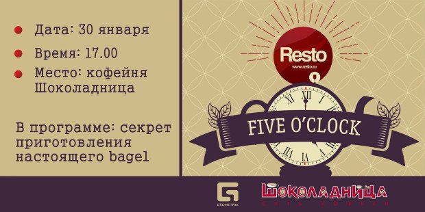 Шоколадно, вкусно, атмосферно - так коротко можно описать предстоящее событие от гастрономического портала Resto.ru и портала светской хроники Geometria.ru . Тематический Five o'Clock Tea - «Bagel party».